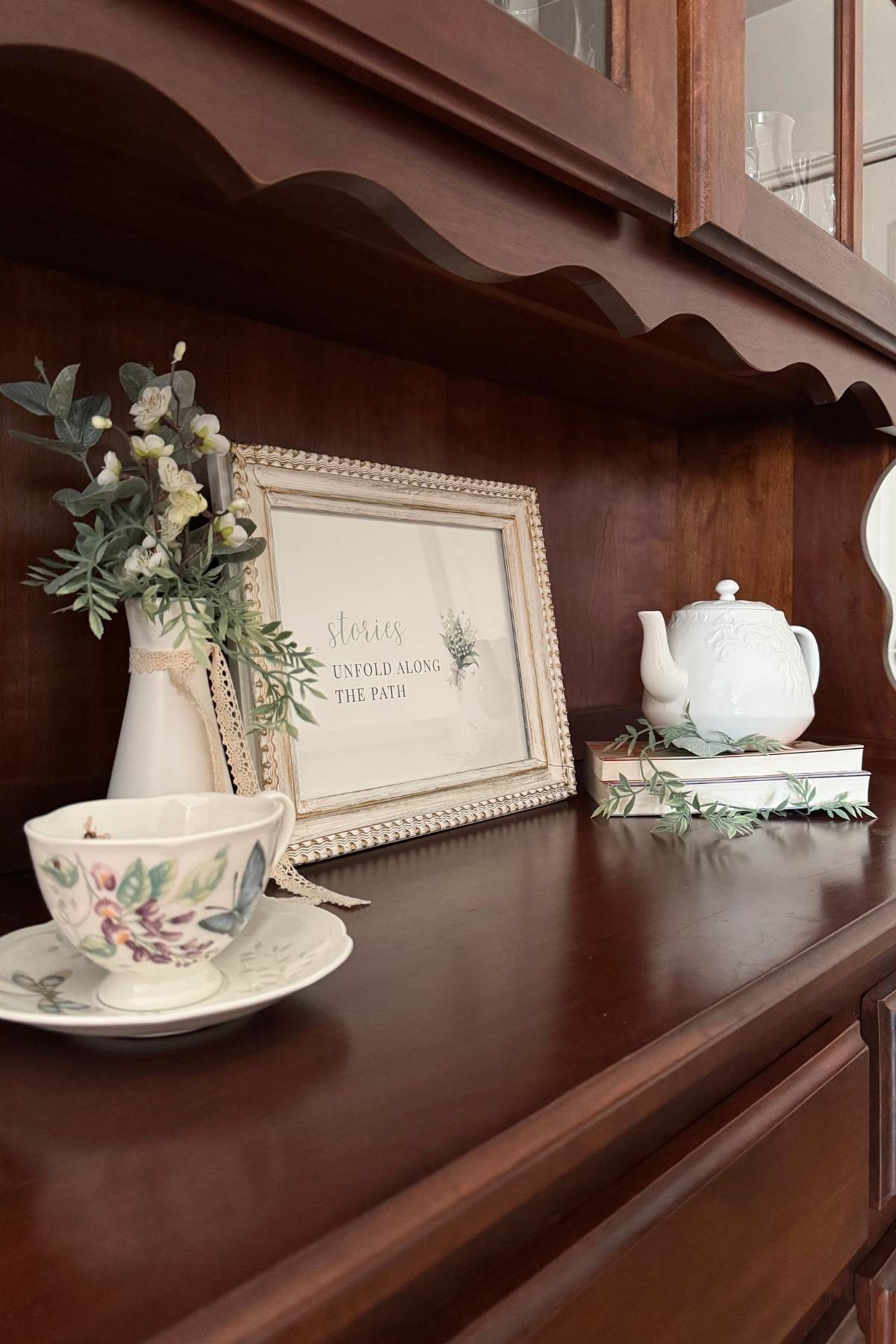When I began to decorate the china cabinet for spring, I thought for a moment, what does spring mean to me? What is the spring story I’d like to bring to life?