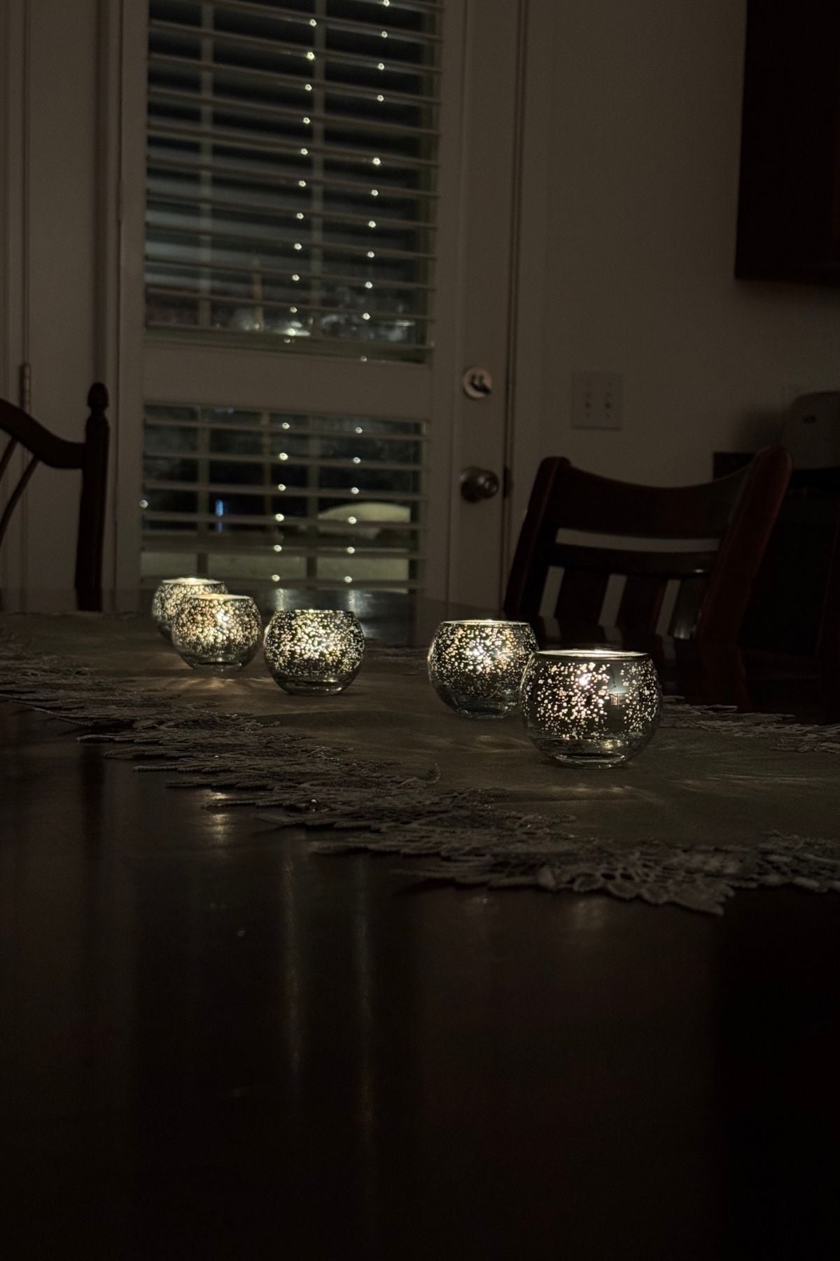 I wanted to keep the everyday look for the dining table simple and uncluttered. I started with a delicate silver lace table runner as a base and added rounded mercury votives along it, creating a glowing ribbon of light.