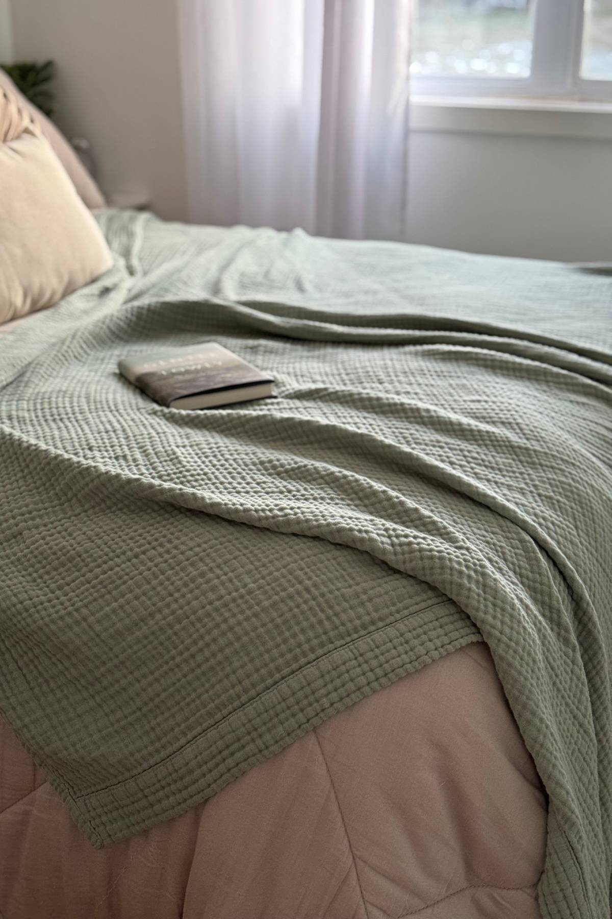 My next purchase was a sage 4-layer muslin blanket. Upon receiving the four-layer one, I was delighted to notice how soft and light it felt. It drapes beautifully over a bed or couch, which is a must.