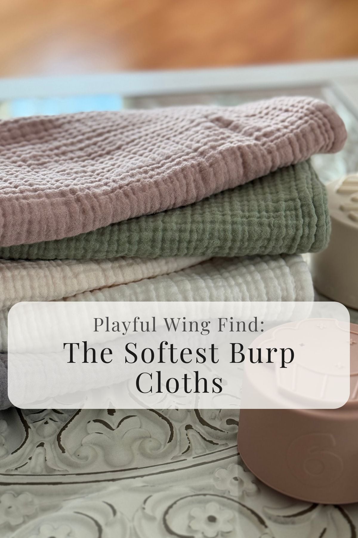 I keep these soft muslin burp cloths on hand for when my grandbaby visits. The cloths live in a small basket in the Rose Parlour, ready for cuddles, feedings, and everyday little messes.