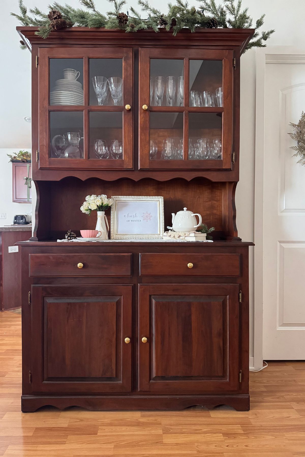 The hutch is used for storing glasses, plates, and a couple of pitchers. I let it be this winter, but I could have added fairy lights and shimmering snowflakes.